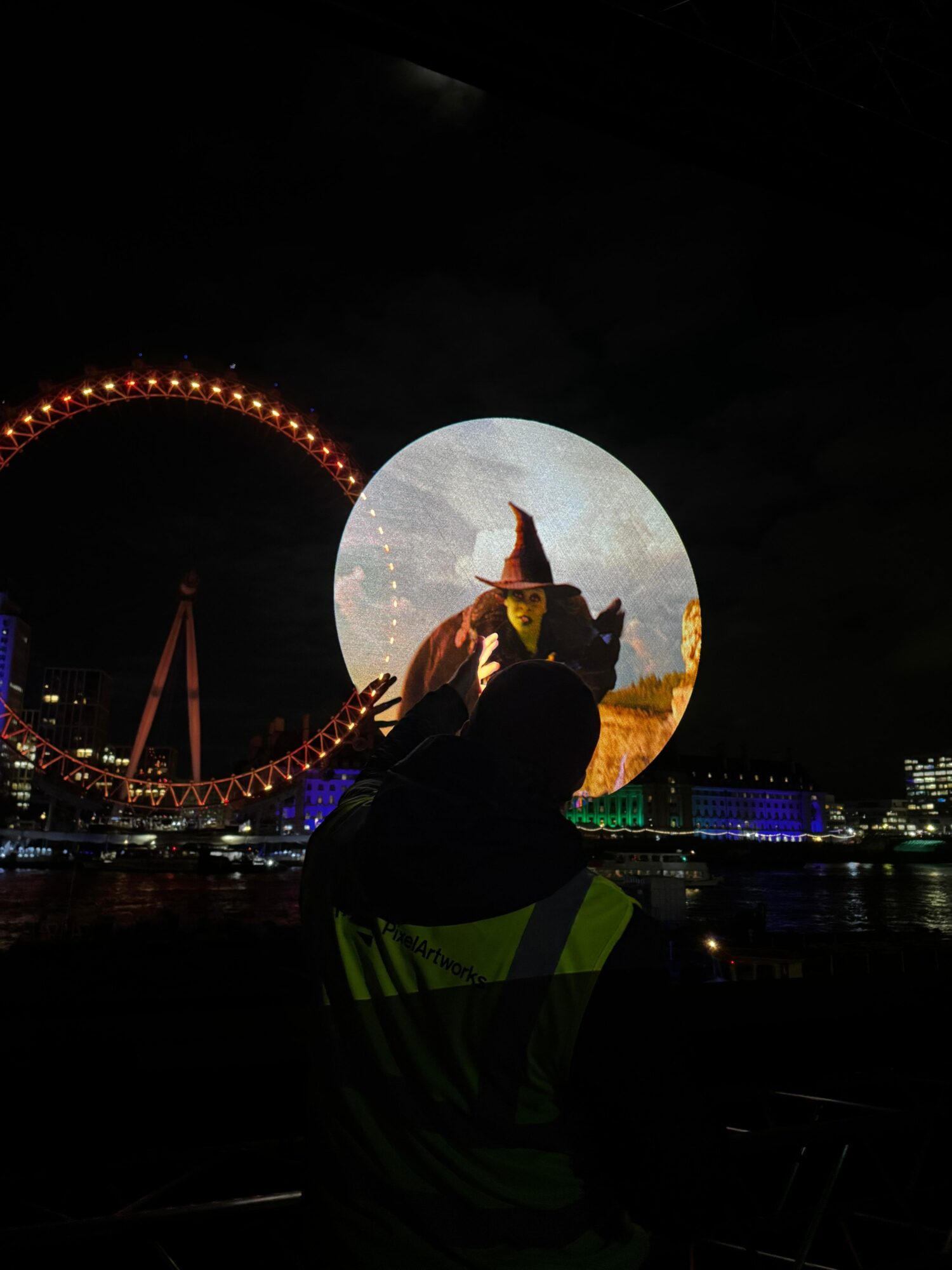 The effect was achieved by projecting onto Hologauze, a specialised projection screen designed to create holographic effects. It’s a patented gauze coated with a highly reflective silver metallic layer. This unique design allows the gauze to reflect projected images or animations while still remaining transparent enough for viewers to see the fireworks behind it – this is crucial for making the illusion work on broadcast. This year we were able to push the creative potential even further, and play with perspective, even breaking the frame of the London Eye with dynamic content.