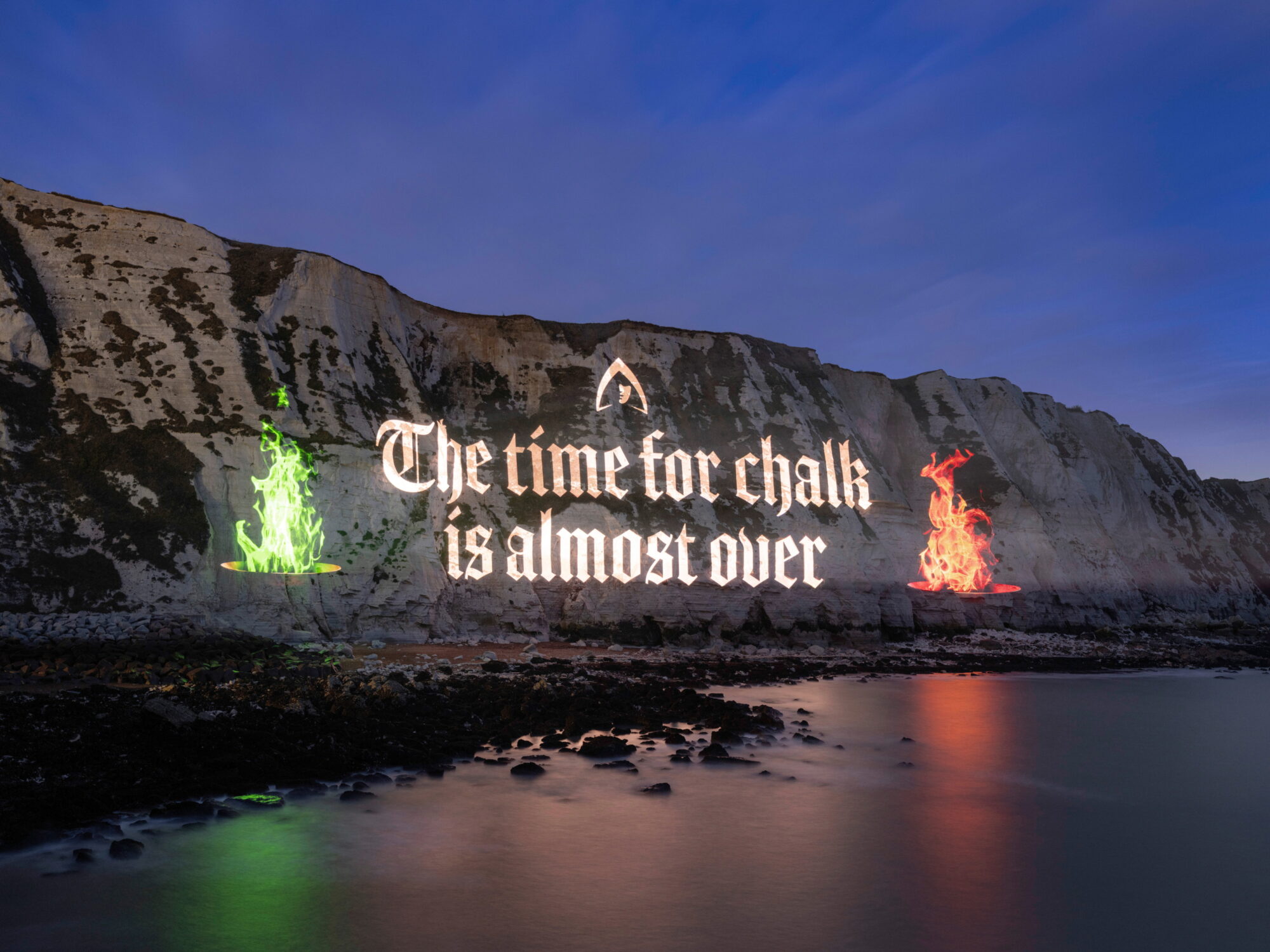 Projecting a pun that would make Claudia proud. The White Cliffs of Dover, selected for their chalky façade and bold impact, became the focal point of this hype building campaign, signifying that ‘The Time for Chalk is Almost Over.’ The phrase is a play on words of Winkleman’s well-known phrase, “the time for talk is over,” which ends the roundtable discussions, prompting players to vote to decide who is the next to be banished from the castle.